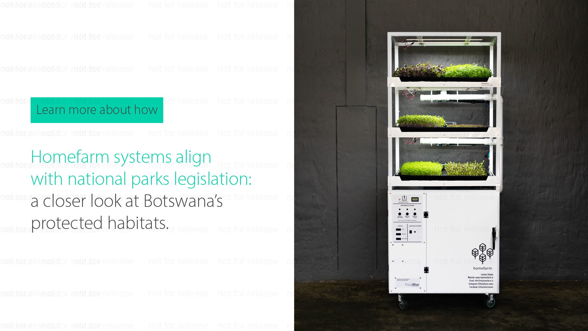 A review of Botswana’s Wildlife Conservation and National Parks Act (1992) and the United Nations compliant Plant Protection Act (2009) indicates that the Homefarm Commercial System can be used to grow delicate greens in protected reserves. The indoor system mitigates against attracting wildlife and crops don’t grow all the way to seed, so they won’t propagate themselves unchecked.