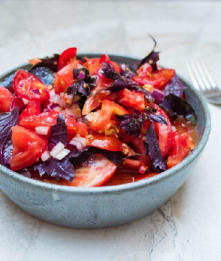 - Add the red onion to a bowl, then the tomatoes. Add a little salt and pepper. Leave for 10 minutes to allow the tomatoes to release some of their juices, and the onion to soften a little.