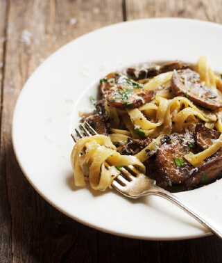 - When all mushrooms are browned and as pasta boils, wipe out your skillet and return all the mushrooms to the pan. Re-heat over medium heat until warmed through. Add wine and allow to simmer until wine reduces by half. Add grainy mustard and dried tarragon or thyme. Stir well to combine. Reduce heat to medium-low. Add the cream, half of the grated Parmesan, a bit of salt and freshly ground pepper and stir well to combine (pasta should be just about cooked by now. If not, remove pan from heat until pasta is ready).